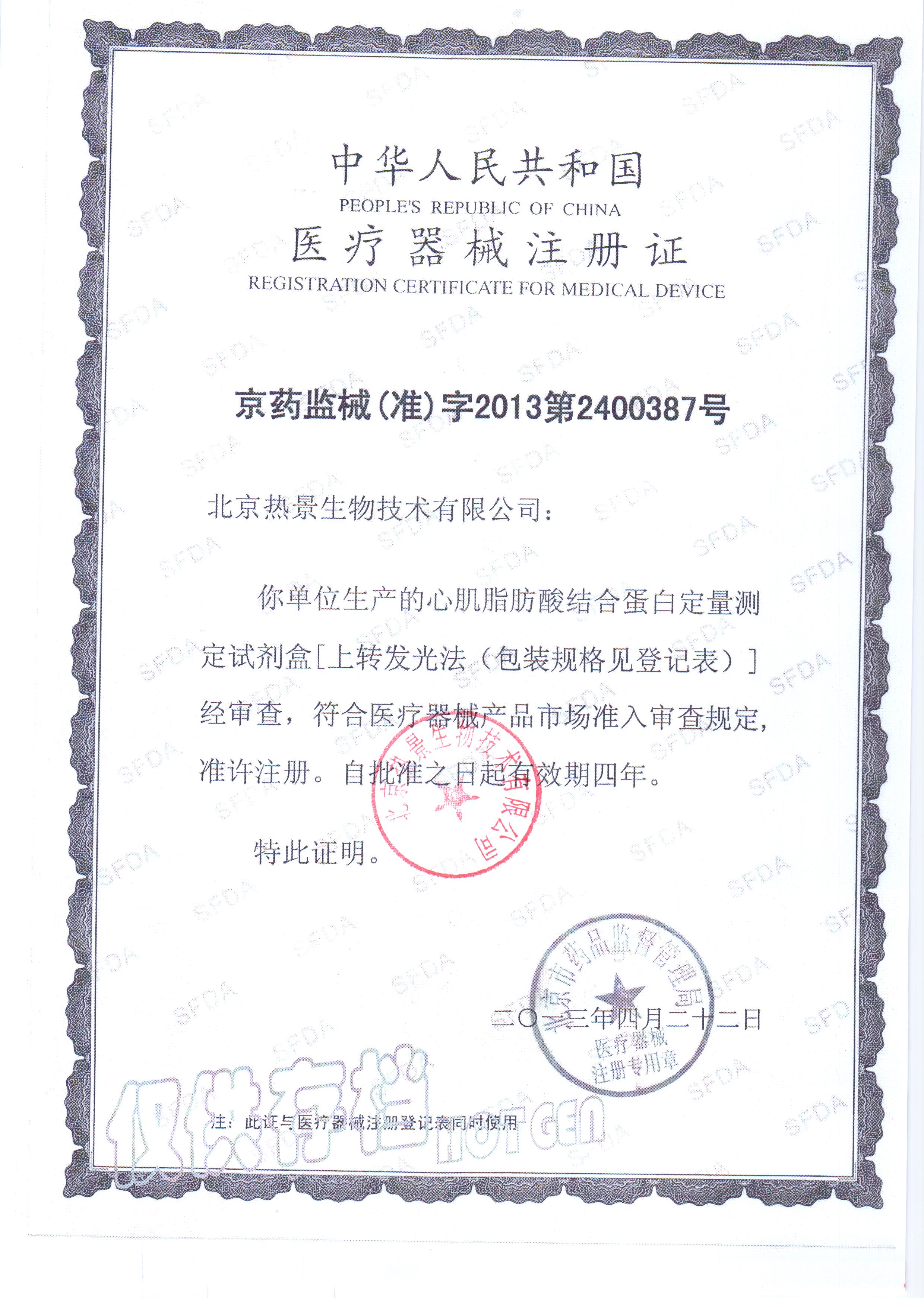 通過(guò)多人的共同努力,熱景生物心肌脂肪酸結(jié)合蛋白定量測(cè)定試劑盒(上轉(zhuǎn)發(fā)光法)獲得醫(yī)療器械注冊(cè)證,注冊(cè)證號(hào):京藥監(jiān)械(準(zhǔn))字2013第2400387號(hào)。