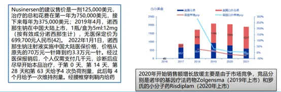 Nusinersen(諾西那生鈉):2016年首次上市,由Ionis研發(fā),是一種反義寡核苷酸(ASO),諾西那生鈉注射液可以改變SMN2前mRNA的剪接,從而增加完整長(zhǎng)度SMN蛋白的產(chǎn)生。2019年中國(guó)獲批上市,且于2021年納入國(guó)家醫(yī)保目錄。諾西那生鈉可用于出生3天的嬰兒到80歲的老人,適用人群非常廣泛。截止到2021年,全球有11000人使用過諾西那生鈉。