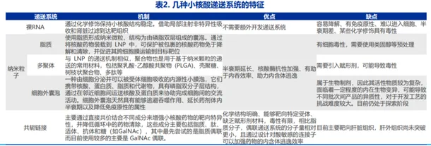 按照不同遞送技術(shù)分類,可以分為裸露RNA修飾遞送技術(shù)、脂質(zhì)體納米遞送技術(shù)、共軛連接遞送系統(tǒng)(小分子配體、抗體及其他分子)和其他多種類型的新型遞送系統(tǒng)(如多聚體納米粒遞送系統(tǒng)、細(xì)胞外囊泡遞送系統(tǒng))。其中,LNP和GaINac技術(shù)相對(duì)成熟。GaINac技術(shù)主要靶向肝臟,未來靶向其他器官的藥物遞送系統(tǒng)也有望突破,如Alnylam和 Arrowhead正在研發(fā)的針對(duì)中樞神經(jīng)系統(tǒng)、眼睛、腎癌細(xì)胞與肺上皮細(xì)胞等遞送系統(tǒng)。