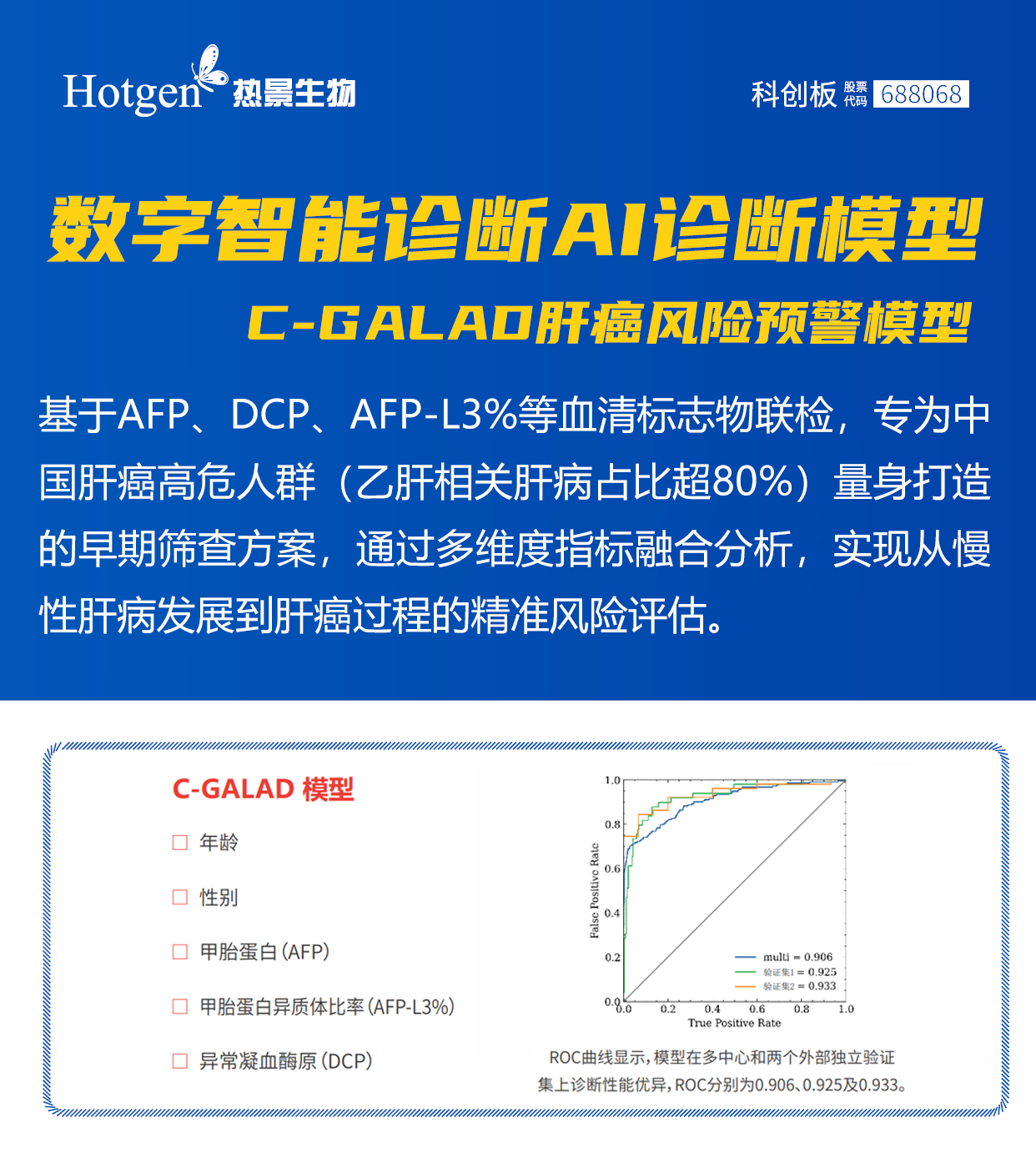? 精準(zhǔn)診斷:基于中國(guó)人群數(shù)據(jù)開發(fā)的C-GALAD模型,整合多組學(xué)生物標(biāo)志物(如AFP、AFP-L3%、DCP等)及AI算法,顯著提升極早期肝癌診斷敏感性和特異性,該技術(shù)已通過中檢院注冊(cè)檢驗(yàn),并與30余家三甲醫(yī)院開展臨床合作。