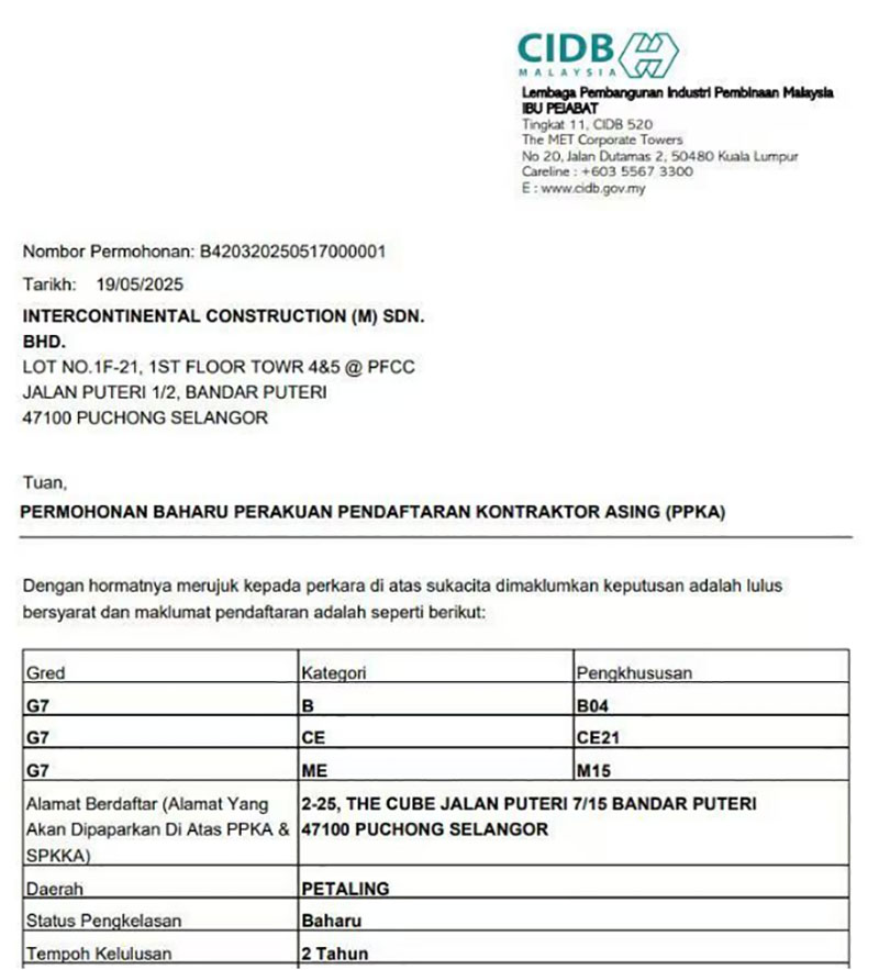 近日,經馬來西亞建筑工業發展局(CIDB)批準,合景建設集團有限公司全資子公司洲際建設(馬來西亞)有限公司取得馬來西亞最高等級G7承包商資質,包括土木工程(CE21)、土建工程(B04)、機電工程(M15)以及各種機械工程等多項內容。這是合景建設在馬來西亞建筑資質領域的重大突破,意味著公司在智慧建筑領域的技術實力、屬地化服務能力及行業影響力獲官方權威認可。